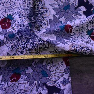 A soft, muted floral print with pops of red, navy, and teal gives this blouse a retro charm. Lightweight and breezy — great for warm weather or layering.