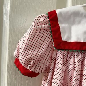 Vintage Classic Film Characters Disney Peter Pan Appliqué Dress Girls Size 3T. Such an adorable little dress, allover red polka dots with a collar and Peter Pan embroidered applique on the front of the dress. This is a vintage piece. Has been worn and stored for a while, there are wrinkles in the applique, but no other issues that I can find. Good Used Condition.