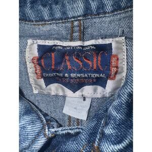 Authentic vintage Classic Jeans denim chore jacket with a timeless mid-blue wash and rugged workwear build. Features four front patch pockets, metal “High-Quality Guaranteed” buttons, and contrast orange stitching. Perfectly worn in with a soft, broken-in feel — ideal for collectors, workwear enthusiasts, or anyone chasing that classic Americana denim look.