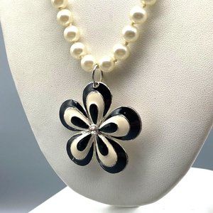 Vintage Classic Pearl Strand Necklace with Enamel Flower Pendant, White Strand with Black and White Floral with Crystal Center