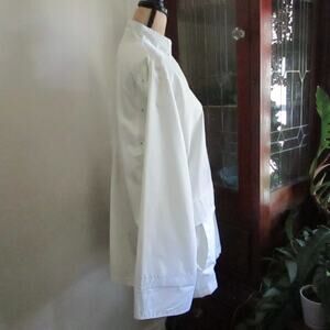 Timeless vintage white utility windbreaker jacket by Classic, in excellent condition with no noted flaws. Features a snap-button front, roll-cuff sleeves, navy blue stand collar with coordinating cuff lining, four exterior pockets, and decorative lace-hole grommets at the shoulders. Lightweight, boxy silhouette with a slightly oversized fit. Unlined.