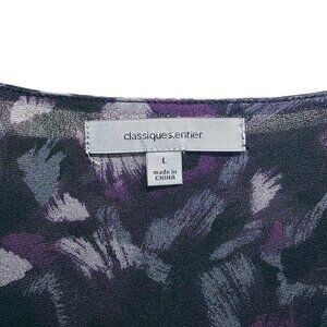 This elegant top by Classiques Entier offers a luxurious blend of silk and nylon, ensuring comfort and style. With its unique ruched design and V-neckline, it adds sophistication to any wardrobe. The purple, black, and shades of gray geometric modern art style pattern provides a bold aesthetic, making it a standout piece for stylish ensembles.