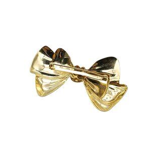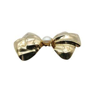 Vintage Classy Bow Brooch with Faux Pearl Cabochon, Polished Gold Tone Lapel Pin, Elegant Ribbon
