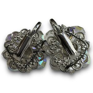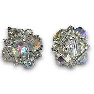 Vintage Classy Silver Toned Iridescent Aurora Borealis Beaded Crystal Cluster Clip On Earrings
