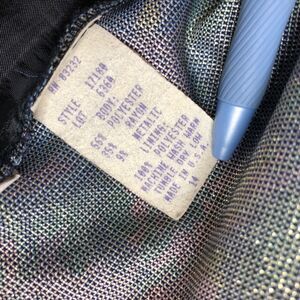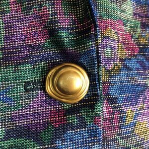 Features-On button. Notch collar. Front pockets. Lined. Iridescent. Metallic accent threads. All over floral print. Vintage. Made in USA. 80s. 90s.