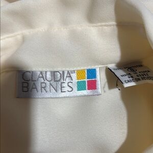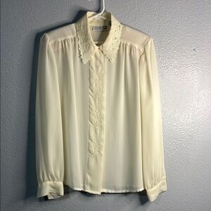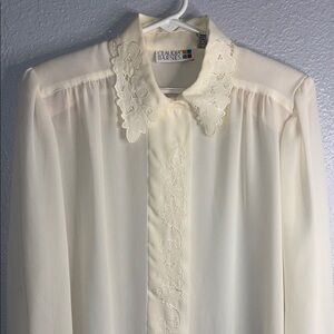 Vintage ivory blouse by Claudia Barnes, made in Korea. Features a romantic embroidered lace collar and matching floral embroidery along the front button placket. Includes original shoulder pads for that classic 80s silhouette. Soft, lightweight 100% polyester with a semi-sheer finish. Elegant puffed sleeves with buttoned cuffs. Timeless, feminine, and perfect for vintage lovers or soft office looks.