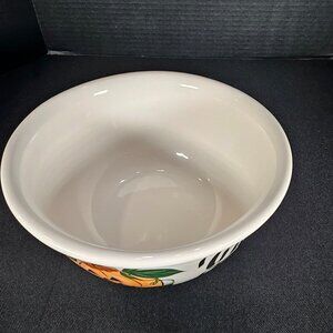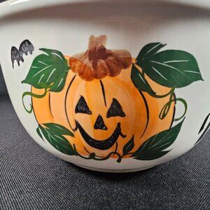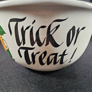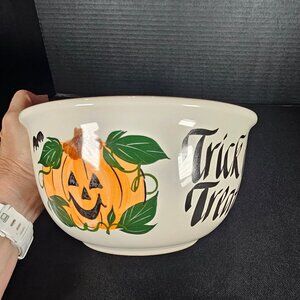 A white pottery bowl by Clay Design decorated with a cheerful jack O Lantern and the phrase Trick or Treat. Clay Design is a brand known for creating seasonal and holiday theme bowls. This bowl is large and heavy and would be awesome for Halloween treats but can be used as a serving bowl or mixing bowl. This item is one of the older clay design bowls from the 1990s, so this design is a little harder to find. Stamped on base Clay Design. It is in excellent condition. Measures 8.5 inches in diameter, 4.5 inches high. Non-smoking pet free home.