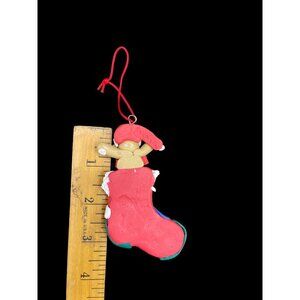 Vintage Clay Dough Christmas Stocking Ornament With Teddy Bear Design. This charming clay ornament features a teddy bear peeking out of a festive stocking. Its vibrant colors and intricate detailing make it a delightful addition to holiday decorations.