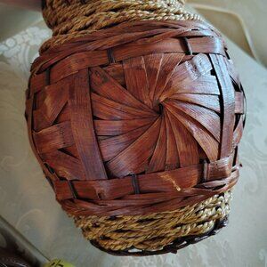 Vintage Clay Pot Vase Wrapped In Woven Wood & Wicker. Handmade