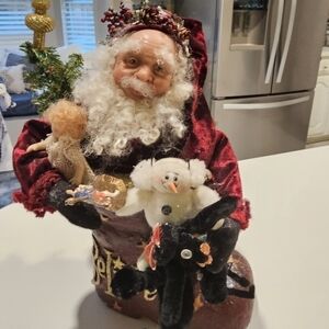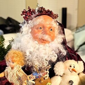 Santa has a rich burgundy hooded cape w a crown of berries & pinecones