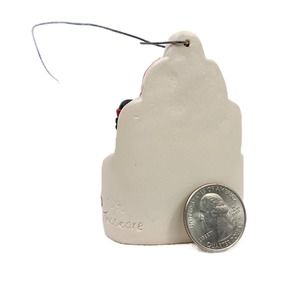 This 1990 Cleo Teissedre ornament is approximately 3" tall and about 2.5" wide. Pre-owned in great condition- no chips or cracks noted.