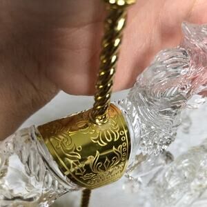 Keywords: lucite, glass look, merry-go-round, Victorian style, gold tone, twisted pole, holiday decor, Christmas tree, set of 2, lightweight, clear plastic, collectible ornament