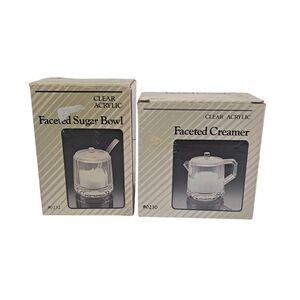 Vintage Clear Acrylic Faceted Sugar Bowl W/Spoon and Creamer NOS