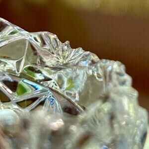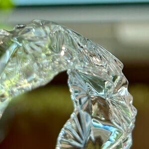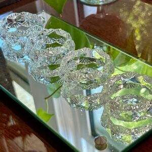 Vintage Clear Crystal Daisy & Button Design Napkin Rings Set of 6. Each measures approximately 2 inches in width. Made from high-quality crystal, they are perfect for adding a touch of elegance to any occasion. The napkin rings are in good vintage condition, with some minor flea bite chips that blend into the design and are difficult to see.
