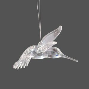 This exquisite glass hummingbird ornament captures delicate beauty with its transparent design and intricate detailing. Its suspended form adds a touch of elegance to any space, making it suitable for either indoor or outdoor settings, holidays or every day. It is crystal clear transparent with a lovely sparkle in the sun, and the eyes are bright blue.