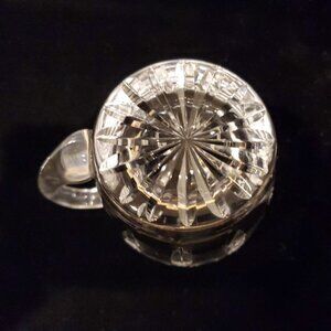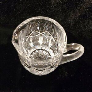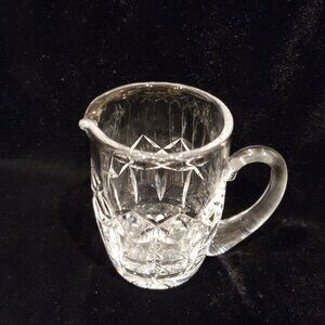 This elegant classy small pitcher can be used for creamer, syrup, water etc. It is approx. 4" high & holds approx. 9 ounces and is very heavy in weight. This pitcher has a unique diamond cut design. It also has a starburst cut pattern on bottom.