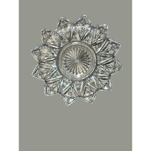 This elegant vintage glass plate features a striking starburst design, perfect for adding a touch of sophistication to any table setting. Crafted from high-quality clear glass, it serves as a versatile piece for both decorative and functional purposes. Ideal for showcasing desserts or as a centerpiece. Approx. size 6 1/2" wide.