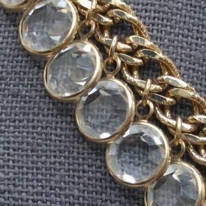 *Description: This is a beautiful vintage necklace with dangling clear flat back crystals on a double link chain. There are two dangling crystals on one end and a hook on the other. Along the edge of the double chain links is textured. Using the hook clasp, you can make the length adjustable up to 16 1/2 Inches. This would be a great addition to your jewelry collection or make a great gift!