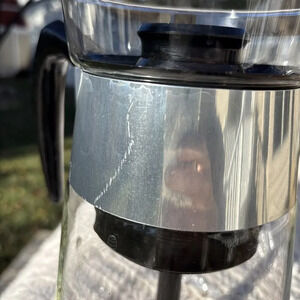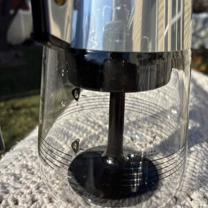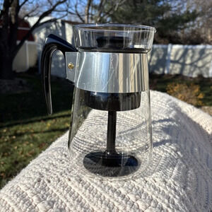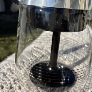 This vintage glass coffee tea pot is a must-have for any collector of kitchen appliances. Made by CorningWare in the United States, this clear glass pot has a capacity of 6 cups and is perfect for serving your favorite hot beverages. The pot is in great shape and has been well-maintained over the years.