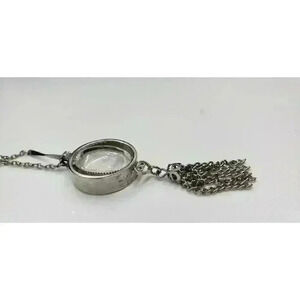 Beautiful vintage necklace from the 1970 is guaranteed to be noticed. This is a double chain meaning that it is one necklace however there are 2 chains, 1 shorter than the other. The longer chain is accented with a clear glass Reverse carved cameo. There is also a silver chain tasseled that hangs from the cameo