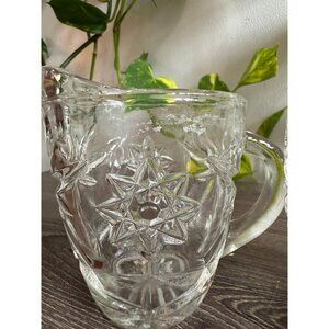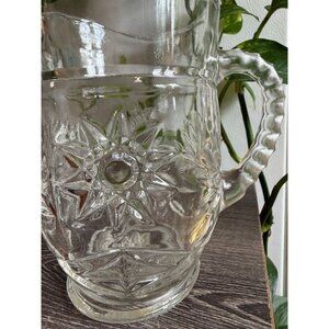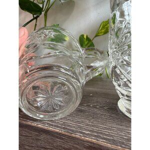 Beautiful vintage glass creamer and sugar set featuring a raised starburst design and textured handles. Clear glass with a sturdy, elegant shape—perfect for table settings, tea service, or display in a farmhouse or vintage-style kitchen.