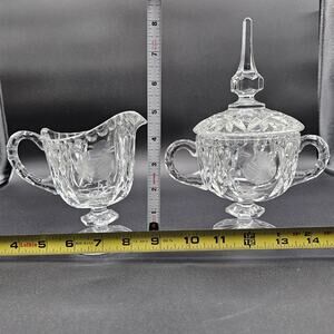Vintage Clear Glass Crystal Footed Creamer & Sugar Set Etched Rose Pedestal. Measurements in the pictures - no chips or cracks. Vintage elegance for your table. This vintage clear glass crystal creamer and sugar set features a footed pedestal design with delicate etched rose detailing. Perfect for adding an elegant touch to your table, this set is both decorative and functional. The crystal-clear glass enhances its beauty, making it ideal for collectors or those who appreciate classic tableware. Whether for daily use or display, this set brings a refined charm to any setting.