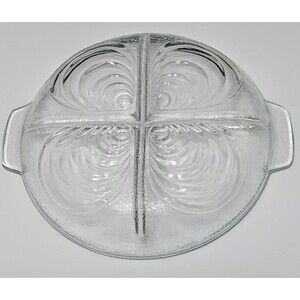 Once upon a table, this sparkling glass dish would appear at every family gathering, filled with pickles, olives, cheeses, and sweet treats. Its swirling mid-century design catches the light beautifully, turning everyday snacks into little works of art. With four divided sections and easy-to-hold handles, it was made to bring people together around shared flavors and laughter.