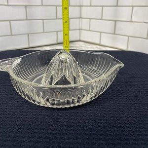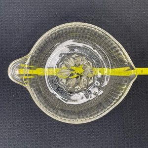 Juicing is actually much easier with this vintage reamer vs the hand squeezing juicers. This vintage clear glass juicer looks lovely, is practical, and hold lots of juice. Complete with handy spout to pour the juice into any container, even narrow ones. Flat handled vertically ribbed depression on bowl. Normal wear, no damage, see pictures.