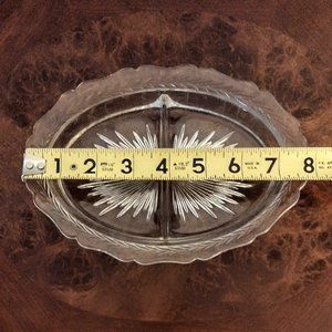 This is a beautiful divided relish dish with a sparkling Starburst pattern. This oval serving dish measures approximately 8-in. Long x 5.5-In. Wide.