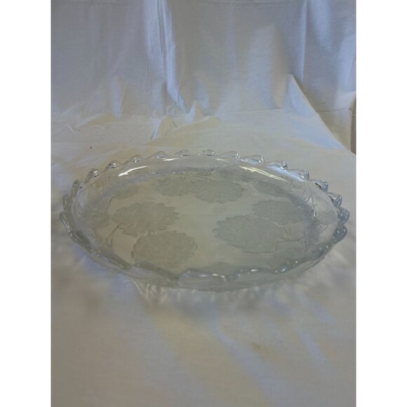 Vintage Clear Glass Pie Plate With Floral Etched Design & Scalloped Edges