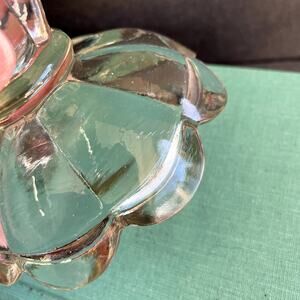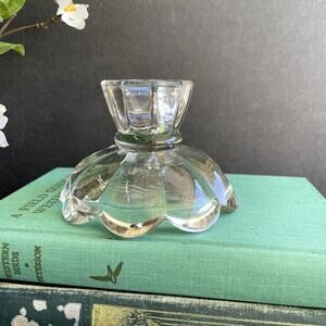 Vintage clear glass scalloped candlestick candle holder, fits taper size candles. Can also flip upside down and works as a little trinket dish. Very good condition with no chips or cracks, and a few shallow scratches as shown; please see pictures. Measures about 3" tall and 4" bottom diameter.