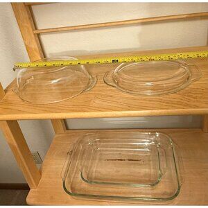 Four pieces of glassware. Pyrex brand visible on some. Set includes: