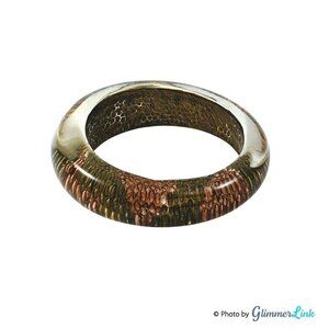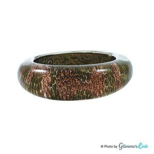 Vintage clear Lucite bangle bracelet featuring a reversed carved and painted snake skin pattern with metallic shades of green and copper.