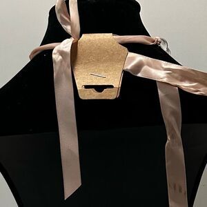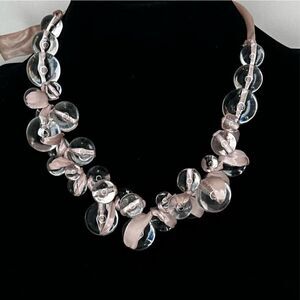 The necklace features 10" of charming, transparent clustered bubble beads strung along an 18" pink ribbon on each side, allowing for an adjustable tie closure at the back of the neck. The soft pink ribbon weaves delicately through the bubbles, adding a unique color contrast that enhances its statement appeal.