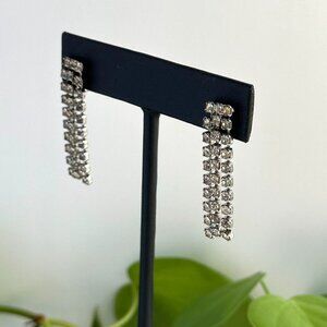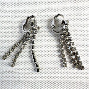 These vintage clip-on earrings have clear rhinestones and a 1.5-inch dangle length. Ideal for effortless accessorizing.