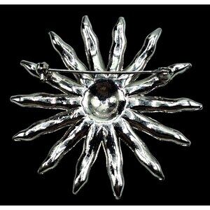 This vintage brooch features a radiant starburst design adorned with sparkling clear rhinestones. Its timeless elegance makes it a standout accessory for any vintage jewelry collection. There is minor yellowing in a couple of places but it is not really noticeable in person. The center protrudes higher than the base. I have had this brooch for several years trying to convince myself that there must be a maker's mark on it. Lol! Unofrtunately, there is not. It always reminded me of a sun star starfish. It measures a little over 2" across.