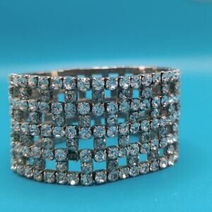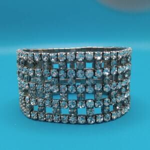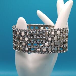 Vintage Clear Rhinestone Stretch Bracelet Silver Tone Wide Sparkling Cuff