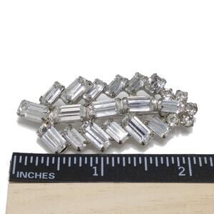 *Description: Gorgeous clear rhinestone leaf brooch with emerald cut clear crystal rhinestones with a shiny silver tone backing from the 1960s. The backing is rhodium plated. The brooch is beautiful and all of the rhinestones are clear and full of sparkle. This would be a great addition to your vintage jewelry collection or make a great vintage gift!
