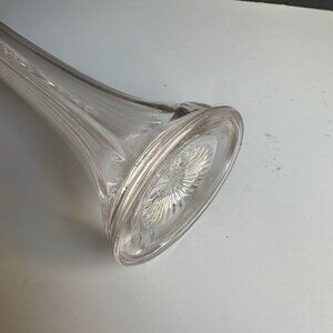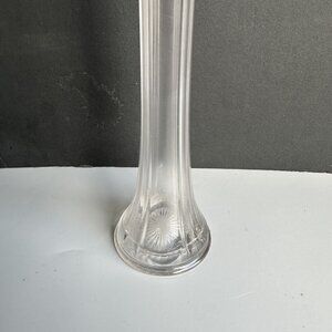 This listing is for a beautiful tall and slender ribbed clear glass vase with 4 fingers. The base has a starburst design that reflects light up into the vase. Condition is very good, there are no chips, has small scratch top side ( see photos). The interior is slightly foggy Measures 17.25" tall and the base diameter is 3". Nice vintage vase to add to your stretch glass collection !