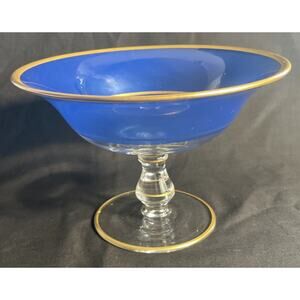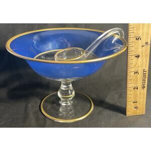 Vintage Clear and Blue Compote Pedestal Bowl and Ladle Gold Trimmed. Good pre-owned condition. No chips or cracks. Some wear on gold rim of ladle. Measurements in photos.