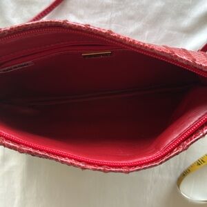 Elevate your style with this stunning red snake print clutch bag. This bag combines elegance and functionality and the bold red color adds a pop to your outfit. Approximate measurements in photos. Excellent condition. Shoulder strap, Zipper top, Inside pocket, Fully lined