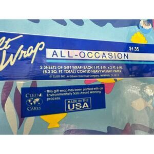 Coated heavy weight paper. Made in the USA. One unopened package which has two sheets of wrapping paper that are 20 x 30" each. Fish / Tropical motif with a classic 90's look.