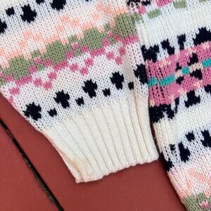 • Vintage Clifton Place Knit Fair Isle Nordic geometric pattern, Mock Neck sweater in cream, black, pink, blue, and green colors. Perfect vintage, 80s, 90s, granny style sweater for fall, winter, and spring. Preppy, cottage, ski lodge, hippie, indie, boho vibes. Made in the USA.