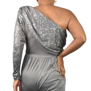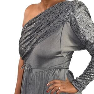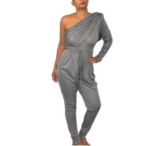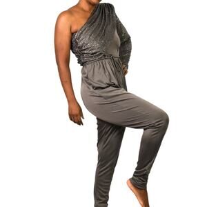 Vintage Climax One Shoulder Jumpsuit Gray Sequin Ruched Draped 70s Retro Small