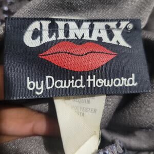 Vintage 70s 80s Climax by David Haywood jumpsuit FEATURES one shoulder bodice with a sequin draped overlay across the chest with sequins extending to the one sleeve. Dolman sleeve. Fitted waist with skinny self fabric tie belt. Draped tapered pant legs with ruching at the lower hem. Side pockets. Shiny stretch jersey fabric. Side zipper closure. Made in USA.