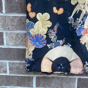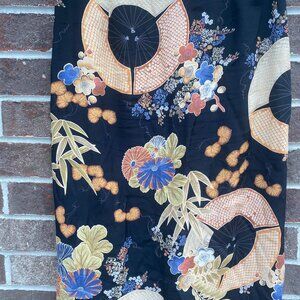Striking vintage Clio skirt featuring a bold Asian-inspired print with parasols, florals, and bamboo on a black background. This piece is a true statement skirt — versatile enough to dress up or style casually with a tee or sweater.