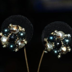Vintage Clip Back black and white pearl earrings, stamped HONG KONG (Used Item)