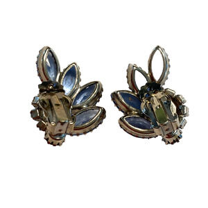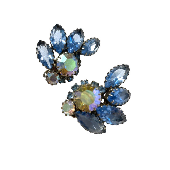 Vintage Clip On Earrings - classic mid century style rhinestones in blue and clear with AB Aurora Borealis finish. The crescent shaped silvertone metal settings are not hallmarked but these appear to be nice quality fashion jewelry. These will benefit from a careful cleaning but even so they are in overall excellent condition - no damage or flaws - just stunning!
