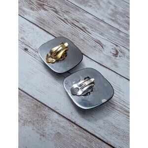 These earrings measure about 1 & 3/8" long. Light weight. Halo has silver tone paint chipping to the front. Some marks and scuffs to the middle front area. Paint chipping to rear. Rear clips do not match. Marks, scratches, and rust to rear.