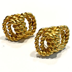 Vintage Clip On Earrings in a goldtone rope textured dimensional knot shape - classic Y2K Boss Lady look. No hallmarks - nice quality fashion jewelry - runway style. In excellent vintage condition - minor wear on goldtone finish - no significant damage or flaws - just stunning!
